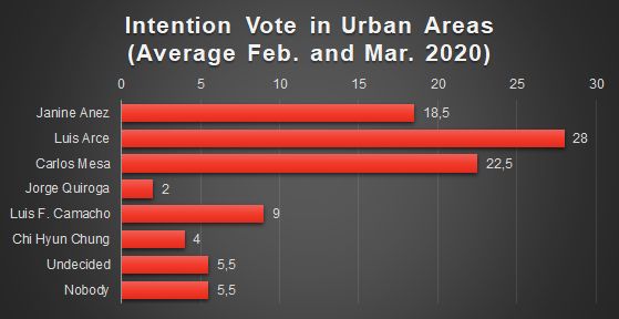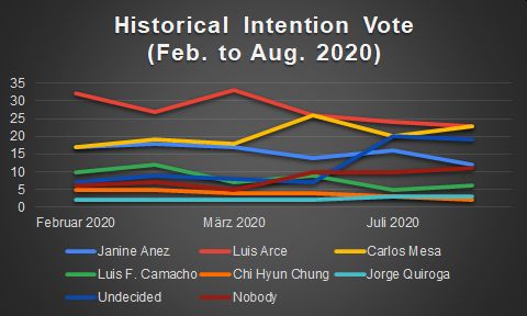 That is the reason why the figures for undecided voters and those who are planning to vote for no one becomes relevant. Again, if we assume this group is made up of undecided voters and that a large majority of them decide to vote for one candidate on election day, any one of the first three candidates has a chance at either being elected directly (Arce and Mesa) or getting in the second round scenario. Granted, it is a mathematical chance, but it is not an entirely theoretical one.
